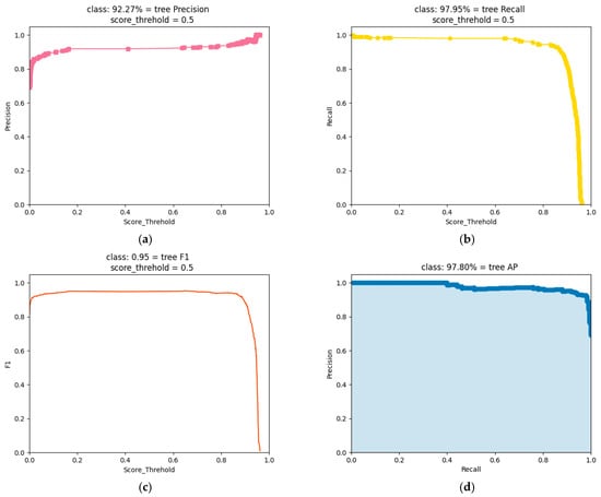 As shown in Table 3, on the fisheye image dataset of trees, the P of Attention-YOLOX-tiny is 92.27%, R is 97.95%, F1 is 0.95, and AP is 97.80%. Most of the performance metrics of Attention-YOLOX-tiny, including R, F1, and AP, are better than YOLOX-s and YOLOX-tiny. The evaluation process of the Attention-YOLOX-tiny detection model is shown in Figure 9.
