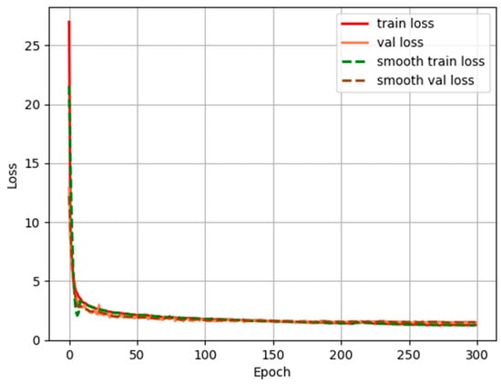 From the detection indicators in Figure 9, it can be concluded that the prediction results of trees can meet the requirements of accurate detection of trees. The LOSS function curve of the training process is shown in Figure 10.