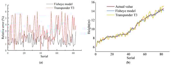 The coordinates of and are the coordinates of the midpoints of the upper and lower frame lines in the image. The fisheye lens measurement model is taken to obtain the predicted tree height. In this experiment, the average value of the ten times measured by the theodolite was taken as the actual value. We selected 83 trees as validation data and for contrastive measurements with Transponder T3. The tree height measurement results are shown in Figure 12; Figure 12a is the comparison of the relative errors of the fisheye model and Transponder T3 and Figure 12b is the comparison of their measurement values.