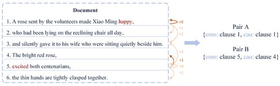“Emotion” has always been the focus of attention in the field of natural language processing. With the deepening of research, the potential causes behind emotions have received extensive attention from scholars. Emotion acquisition and its potential causes are widely used in e-commerce operations, public opinion orientation, and early warning of psychological abnormalities. To solve such problems, Lee et al. [1] proposed the emotion cause extraction (ECE) task. The ECE task aims to extract the underlying causes of emotion correspondence in a given document. However, this task needs to mark the emotion in the document in advance, which limits the application scope of the ECE task to a certain extent. In response to this problem, Xia and Ding et al. [2] proposed a new task, the emotion-cause pair extraction (ECPE) task, which aims to identify all potential emotions and their causes from unannotated documents. As shown in Figure 1, the document is divided into six clauses according to punctuation, where clause 1 and clause 5 contain the emotion words “happy” and “excited”, then clause 1 and clause 5 will be marked as emotion clauses. At the same time, the cause corresponding to “happy” is “A rose sent by the volunteers”, and the cause corresponding to “excited” is “The bright red rose”, so clause 1 and clause 4 will be marked as cause-clauses. Finally, through pairing learning, the output of the final task is the emotion-cause pair: Pair A {1,1}, Pair B {5,4}.