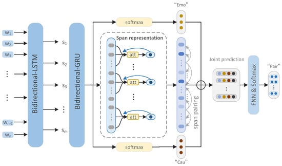 In order to improve the accuracy of emotion-cause prediction, Xia and Ding et al. [2] proposed a two-step framework (ECPE-2Step), which used multi-task learning to predict emotion clausesand cause-clauses, and pair them to form candidate emotion-cause pairs. Then, they used a filter to filter all possible emotion-cause pairs to obtain the final result. Experiments showed the effectiveness of the model, but the accuracy of the first step will directly affect the prediction results of the second step, thus reducing the prediction accuracy. In response to this situation, some scholars [3,4,5,6] proposed to use an end-to-end model to solve the ECPE task. Song et al. [7] used an end-to-end multi-task learning connection framework to solve this problem, regarding the ECPE task as a link prediction problem, and used the biaffine attention mechanism to judge whether there was a directional link between emotion and cause. Ding et al. [8] represented emotion-cause pairs in two dimensions and predicted them.
