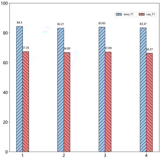 It can be seen from the experiments that on the ECPE task, span 3 was significantly better than the other spans, so that P and R have a good balance, thus obtaining the optimal F1 value. We also analyzed two subtasks, and the performance on the two subtasks was not the same for different spans. Span 1 and Span 3 performed better in the two subtasks, but synthesizing the ECPE task, we finally choose Span 3 as the width of the model. According to the experimental results, we found that the cause for emotion correspondence was generally distributed in the three clauses before and after the clause where the emotion was located, and processing sentences within this range will obtain the best results.