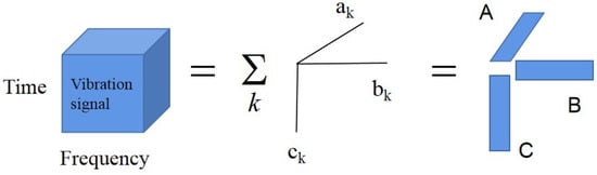 The low range decomposition process of the 3D matrix is identified by Equation (2). The rank of the 3D matrix is and the cube is viewed by the 3D matrix . The data matrix is the three-dimensional time-varying spectrum array obtained by wavelet transformation of vibration signal, and are the number of channels, frequency steps, and the number of data points, respectively.