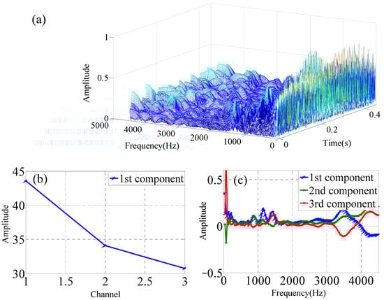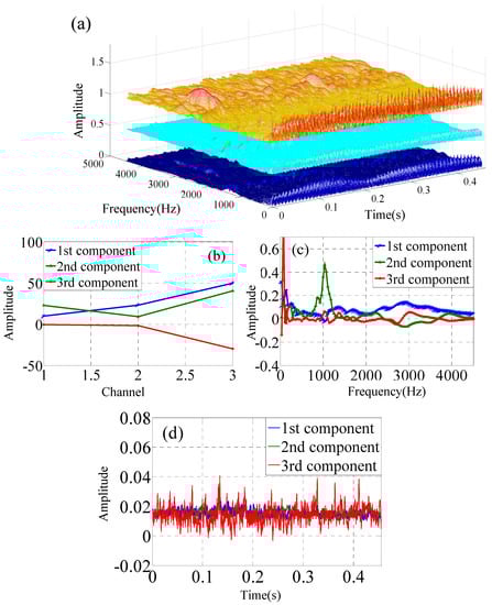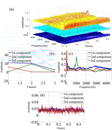 PARAFAC for time–frequency–space data matrix from three sensors under F1 condition. (a) Time–frequency–space with CWT of three-channel data, (b) mode 1, (b,c) mode 2, (d) mode 3.