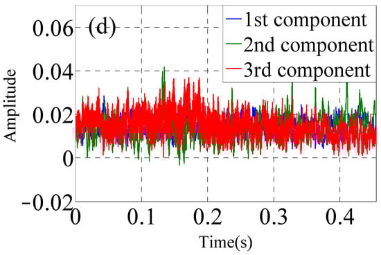 Multi-channel vibration signals include two categories. The one consists of the x-y-z axis at one measurement point of one accelerometer in the operating condition of the slurry pump, which is shown in Figure 5. Another one consists of the three x-axis measurement points of the three accelerometers in the operating condition of the slurry pump, which is shown in Figure 6. The data from one channel is transformed by CWT. The three-channel data are used to construct the three-dimensional time–frequency–space data matrix that is collected by accelerometers simultaneously. The three-dimensional data matrix is analyzed by the PARAFAC decomposition to obtain the three modes.