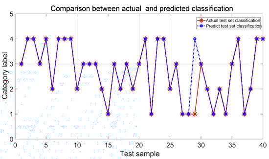 The typical test function is the Ackley function, which is used to evaluate the reasonableness and effectiveness of the IPSO algorithm. The convergence curve of the optimization search is shown in Figure 8. Ultimately, the IPSO algorithm reaches the global optimum in about 10 cycles, which has a fast convergence with reasonably stable and robust results. For the SVM classifier, the IPSO algorithm was applied to optimize the SVM. The comparison of the classification success rates between the actual test set and the prediction test set is shown in Figure 9.