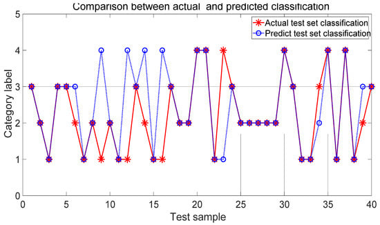 The efficacy of the IPSO-SVM model was assessed to demonstrate the advantages by comparison with the BP network. The configuration of the BP neural network was 6-5-4. The maximum number of iterations was set to be 100. The learning rate was 0.01. The training goal was 0.001. There are 120 data sets, which are randomly chosen as the training samples. There are 40 testing data sets. Figure 10 shows the comparison of the classification between the actual and predicted classification by the BP network.