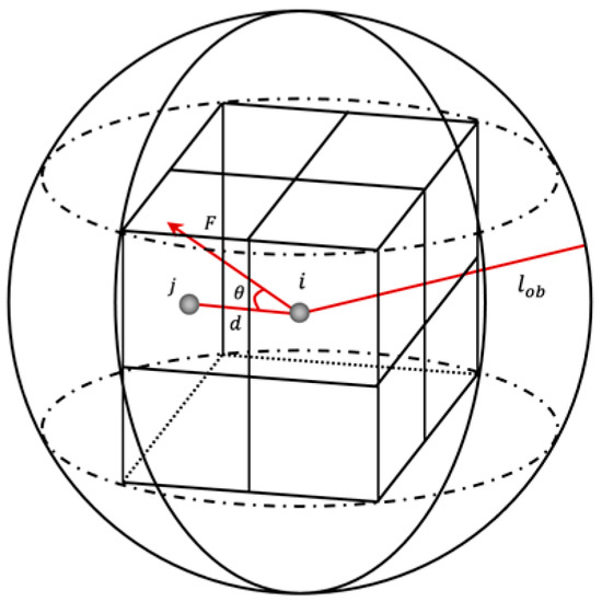 We assume that the pheromone concentration follows a Gaussian distribution and that the pheromone at the current point only spreads to the adjacent forward direction grid. The simplified pheromone diffusion model is a circumscribed sphere, as shown in Figure 3.