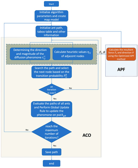 The specific flow chart of the APF-ACO algorithm proposed in this paper is shown in Figure 4.