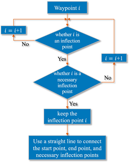 First, find the inflection points in the path that the algorithm gets. Suppose there are path points in the grid space along the path planning direction. The current path point is , and is the distance between point and point . is the distance between point and . is the distance between point and point . Then the inflection point can be judged according to the triangle rule: