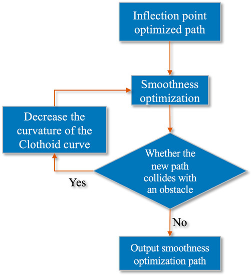 After initially completing the path smoothness optimization, it is also necessary to consider that the optimized path may collide with obstacles again. Therefore, the smooth path must be re-examined. As shown in Figure 7, the initial smooth path is detected. If the path collides with an obstacle, the curvature of the fitted path is reduced for re-planning until the smooth path does not collide with the obstacle.