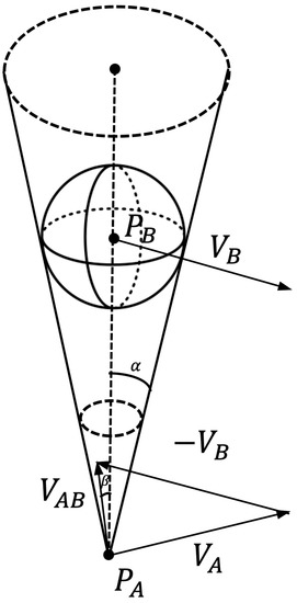 The velocity obstacle method is an algorithm that uses geometric constraints to express methods to avoid collisions with obstacles. Its schematic diagram is shown in Figure 9. Where is the carrier position, is the obstacle position, is the carrier velocity, is the obstacle velocity, is the relative velocity of and . The basic principle of the algorithm is to construct the velocity obstacle area by obtaining the position and velocity information of the carrier and the obstacle. Then, it is determined whether the carrier will collide with the obstacle by calculating whether the relative speed of the carrier and the obstacle is within the space of the obstacle area.