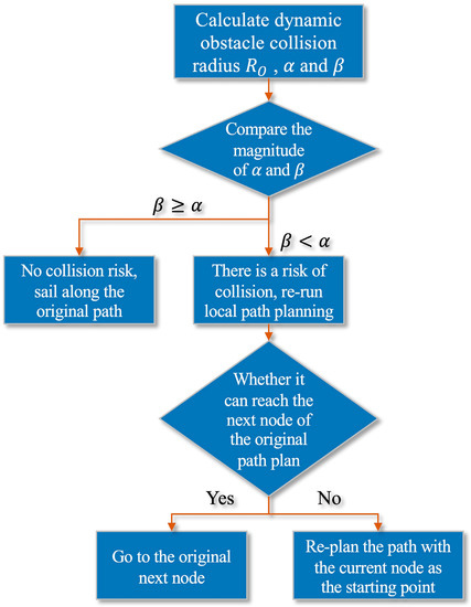 In addition, in order to enhance the adaptability of the algorithm, this paper supplements the dynamic obstacle avoidance algorithm. After dynamic obstacle avoidance, if the current node cannot safely reach the next node of the original path planning result, the current node is used as the starting point for re-path planning. Repeat this operation until the submarine reaches the end. The flow chart of the dynamic obstacle avoidance algorithm is shown in Figure 10.