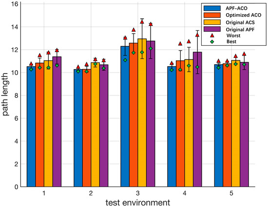 The experimental results are shown in Figure 11 and Table 4. It can be seen from the experimental results that APF-ACO and Optimized ACO have significant advantages compared with the original ACS and the original APF algorithm. This proves the superiority of these two algorithms. In addition, compared with the Optimized ACO algorithm, APF-ACO has advantages in the performance of the best results and the average results and is also better in the control of the worst results and standard deviations. In summary, the path planning results of the APF-ACO algorithm have better performance and are more stable.