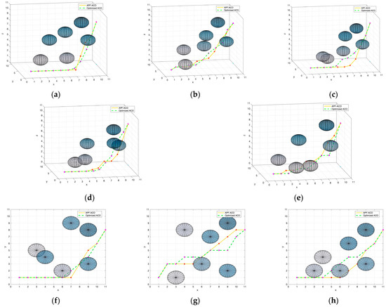 The path planning range selected for this system test is to , and to . The starting point coordinates are , , and 100 m deep. The ending coordinates are , , and 100 m deep. The specific parameters of the APF-ACO algorithm used in this experiment are shown in Table 7.