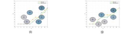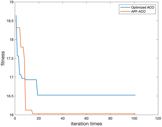 As can be seen from the figure, the convergence speed of APF-ACO is about 47.7% faster than that of Optimized ACO. At the beginning of the iteration, APF-ACO can obtain better initial path results, mainly because the addition of the potential field force parameter can increase the cost difference between the path points to be selected, thereby greatly increasing the probability of selecting a better path. In the later stage of iteration, the convergence result of APF-ACO is significantly better than that of Optimized ACO, mainly because the introduction of the potential field force parameter can always guide the path to find the direction close to the endpoint, avoiding the convergence result falling into the local optimum.