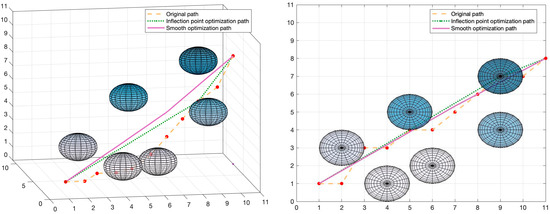 The purple solid line in Figure 15 is the result of smooth optimization at the inflection point optimization path. It can be seen that the optimized path has no abrupt turning points, and the path is smoother. Not only that, but the introduction of the obstacle avoidance correction algorithm also ensures that the smoothed path will not collide with adjacent obstacles.