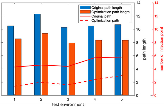 The green dotted line in Figure 14 is the inflection point optimization result. It can be seen intuitively that the inflection point optimization algorithm reduces the number of inflection points and shortens the path length on the premise of ensuring the safety of the path. In order to quantitatively analyze the effect of the inflection point optimization algorithm, we analyzed its performance under five different obstacle environments, and the results are shown in Figure 15. The red implementation in Figure 15 represents the number of inflection points of the original path, and the red dotted line represents the number of optimized inflection points. The inflection point optimization algorithm can effectively shorten the path length by about 21.7% and reduce the number of inflection points by about 53.5%. This verifies the effectiveness of the algorithm.