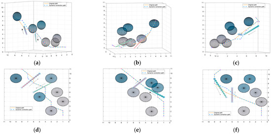 Visualization results of dynamic obstacle avoidance algorithm from a certain perspective (a–c) and top-down perspective (d–f).