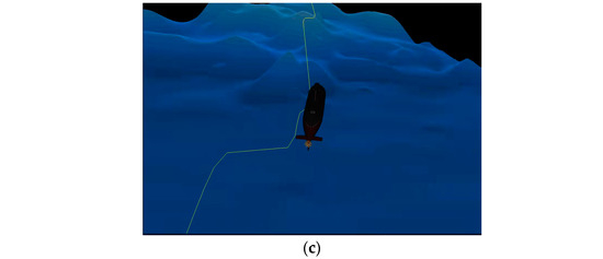 In order to further verify the application of the algorithm proposed in this paper in the real environment, we applied APF-ACO to a semi-physical simulation software specially designed for the study of submarine underwater path planning for experiments. The system uses the 0.25° submarine topography data provided by GEBCO (General Bathymetric Chart of the Oceans) to generate virtual submarine topography to simulate the real underwater navigation environment of submarines. In addition, the system adopts the standard SUBOFF full-body submarine model and fully considers various maneuvering rules that submarines have underwater, such as maximum pitch angle, maximum diving depth, limit turning radius, etc.