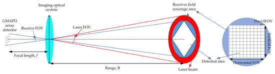 For lidar employing a GMAPD array, the establishment of the lidar geometric model is different from the lidar system with a single detector. For our GML system, the laser was only used to illuminate the surface, and the detector shot a picture with distance, as shown in