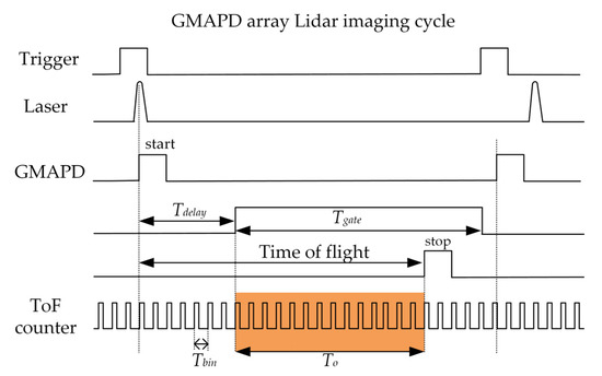 Tbin is the timing resolution of the ToF counter integrated with the GMAPD. Lidar triggers the laser to emit a laser pulse and, in the meantime, triggers the ToF counter to start timing. The range gate delay time (