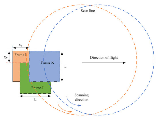 Figure 4, frame I and frame J are adjacent along the scan line in the center of the swath, while frame I and frame K are adjacent across the scan line.