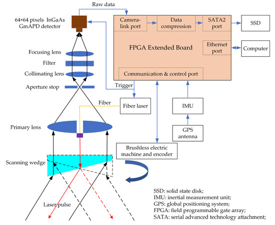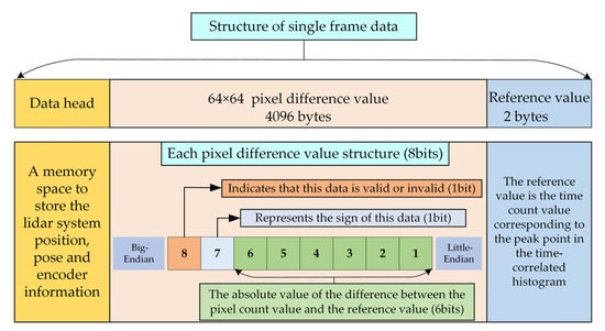 Moreover, in order to match the timestamps between the scanning system, the detector system, and the INS system, the GPS’s PPS signal was used as the synchronization pulse and the internal oscillator clocks on the FPGA for further precision. Finally, the synchronized information, including lidar system position, pose, encoder, and the compressed counting values, was saved in the SSD. The stored structure of data is shown in