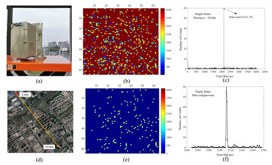 Figure 7, the pixel’s ToF value near the target was reserved, while the others were abandoned after the real-time data compression algorithm. For single-frame data, the root mean square (RMS) range precision of the building was 0.09 m after noise filter processing.