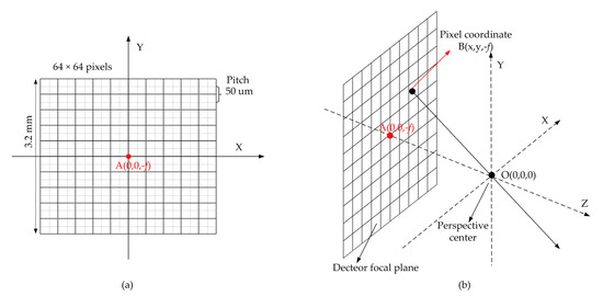 Figure 2. According to the reversibility of light theory, we assumed that the light emits from the pixel in the detector array. The light-emitting unit vector could be easily determined through a ray-tracing model. As described in [