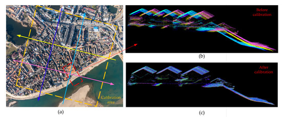 For an airborne lidar, a series of coordinate frame transformations are executed to calculate the geo-referencing of points. First, the 3D coordinates of the laser footprint in the lidar reference frame (LRF) were obtained based on the lidar geometric model. Then, the points in the LRF were transformed to the INS reference frame (IRF) according to the boresight angles. After that, the points in IRF were transformed to the local geodetic frame (LGF) through three attitude angles (roll, pitch, and yaw) provided by the IMU. Finally, the coordinates of the points in LGF were transformed to ECEF reference frame (ERF). The parameters of the transformation from LGF to ERF (including the latitude, the longitude, and the ellipsoidal height) were provided by the GNSS. Referring to the literature [