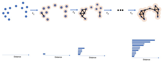Example of a 0-dimensional Persistent Homology Analysis. At the top, the connections between points form as r increases. At the bottom, the barcode originated from the analysis. Each bar represents the distance at which a component has died.