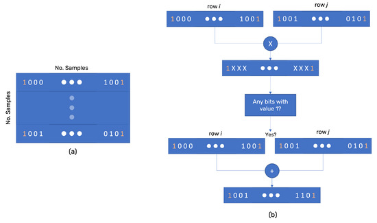 After the distance matrix is calculated, the method iterates through each distance (r) inside the distance matrix. The consideration of each r being a distance value in the matrix is because the first component will die at the minimum distance existing in the matrix, and two components can only exist until the maximum distance in the matrix. For each r, a connection matrix is built. This matrix is a bitmask matrix of row size equal to the number of samples, and each row has a bit size equal to the number of samples (Figure 2a). This is the reason for N to be given by . The bit j of row i takes the value 1 if sample i and j are at a distance equal to or smaller than r.