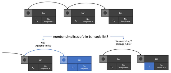 For distance r, the method builds the entire set of simplices that exist. Afterward, the method searches in the BarCode linked list for any node with the same number of simplices. If any match occurs, the method verifies if r is higher than the distance stored in the node. If true, is changed by r, otherwise, continues, as the death value for simplices. If no node matches the simplices’ number, then a new node is created (Figure 3).