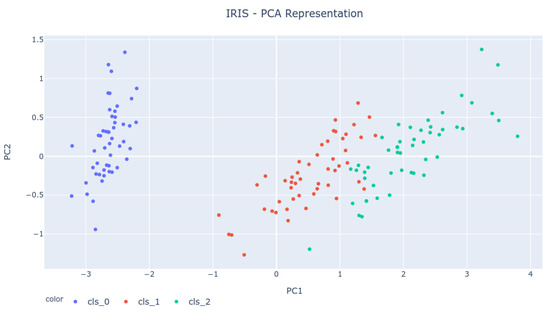 Therefore, by making a PCA analysis of the IRIS dataset, it was possible to reduce the dataset into a two-dimensional space (Principal Components 1 and 2), which compresses much of the dataset’s relevant information and allows for a graphical representation of the feature space. Figure 4 shows the PCA representation of the dataset for the first two principal components. As the image shows, the expectation is to see four bars live longer because of the four clusters (three are well visible, and the fourth is composed of the two top-right green dots).
