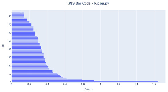 Bar Code obtained from running the developed 0-dimensional homology analysis on the IRIS dataset. The X-axis represents the death of each component. The Y-axis is the array index.