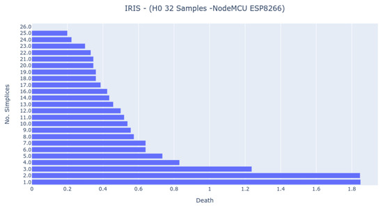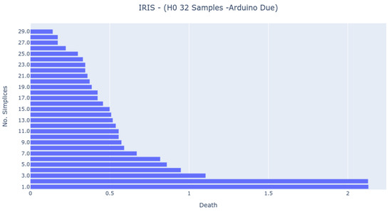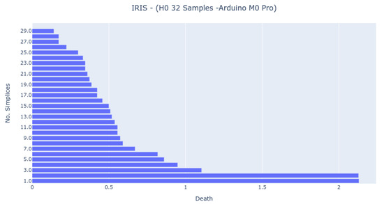 The Bar Codes in Figure 7, Figure 8 and Figure 9 present the results obtained from running the IRIS dataset 0-dimensional analysis on 32 samples. The barcodes are equal in all platforms (with small differences for the NodeMCU 8266). Therefore, the method is platform-independent. The barcode is also similar to the one obtained from the third-party tool. The important thing to notice is that the death of the last two simplices (to merge into one) happens at a greater distance than all others. This is the expected behavior by looking at the PCA Analysis.