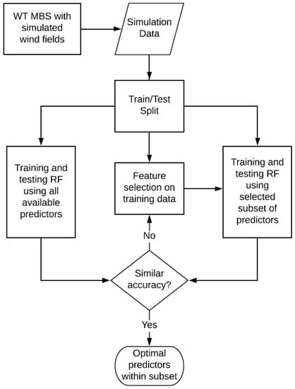 The methodology for identifying highly influential predictor variables with respect to virtual sensing performance is based on an iterative training and testing of RF models in order to discover the patterns in the available data. Figure 2 provides an overview of the methodology. As mentioned earlier, in order to obtain the available data listed in Table 1, a model of the Vestas V52 WT was subjected to a simulated wind field in a virtual multibody simulation (MBS) environment [9]. The simulated wind fields were generated in accordance with design load cases from the IEC 61400 standard [50]. During simulated operation, time-series data of the 6-degree of freedom (6-DOF) transmission input loads were extracted, as well as signals from potential sensor locations covering deformations, misalignments, and rotational speeds at various drivetrain locations. These locations were selected based on an initial hypothesis of sensor locations suspected to be useful and practical for the envisaged transmission input load virtual sensor. However, as the computational cost of adding sensors to the WT model in the simulation environment is relatively low, additional locations could be investigated.