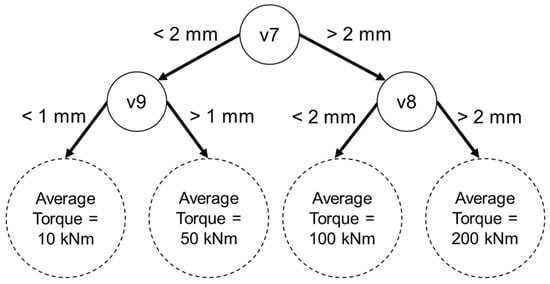 Figure 3 illustrates an example regression decision tree aimed at estimating torque based on v7, v8, and v9 as input variables. As a reminder, Table 1 lists the parameter measured by v7 to be displacement of the right hand-side GB torque arm along the x-axis, and Figure 1 demonstrates the orientation of the x-axis relative to the WT drivetrain. Starting from the root of the tree at the top of Figure 3, a given data point follows either the right or left path depending on its value for v7. It then follows the appropriate path depending on its value for v8 or v9 to the so-called leaves of the decision tree, illustrated as dotted circles in Figure 3. After a number of data points make their way from the root of the tree to one of its four leaves depending on the values of their respective input variables, the average of the target variable (in this example, torque) of the group of data points that reached each leaf is shown in the figure. This process is referred to as training the decision tree. In the example tree shown in Figure 3, the average torque of the data points that reached the leftmost leaf is 10 kNm. If a new data point with an unknown torque reaches the leftmost leaf; then, the decision tree estimates that the torque for that data point is 10 kNm. A regression RF model contains several such regression decision trees with different numbers of branches and different splitting thresholds at each branch to, collectively, reach a more accurate estimation of the target variable as compared to the estimation reached by an individual decision tree. Breiman [33] provides more information about random forests.