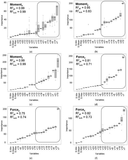 In order to identify the most influential predictor variables with respect to estimation accuracy, the Boruta algorithm [51] was used to iteratively remove predictors less important than the shadows in 6-DOF load estimation. This process was applied for each of the 6-DOF transmission input loads. The results indicate that for each RF model estimating a specific target variable, a subset of available predictors is of particularly high importance with respect to model accuracy. The Boruta algorithm was applied once for each of the six target variables, resulting in the six plots shown in Figure 4. Also shown in the figure, the minimum, mean, and maximum importance values of the shadows are indicated as S.Min, S.Mean, and S.Max, respectively. In Figure 4, it is clear that all predictors were found to be important, as none have an importance lower than S.Max. In other words, no shadow variable was found to be more important than any of the available predictor variables. However, the plot shows that a subset of the available predictor variables (shown encompassed within a rounded rectangle) was found to be highly important in comparison to the remaining predictors for estimating each of the 6-DOF transmission input loads.