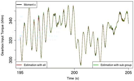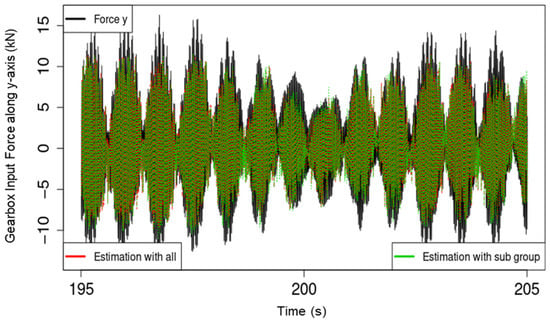 The relatively lower sensitivity of the developed RF models to input forces (force along the x-, y-, and z-axes) is likely be due to the drivetrain configuration of the Vestas V52 WT MBS model, which was used to generate the data. The WT drivetrain has a four-point bearing suspension configuration, which is designed to eliminate all GB input loads, apart from torque, using the main bearing configuration of the drivetrain. This would also explain the contrasting performance between the model estimates of torque and those of the force along the y-axis, as shown in Figure 5 and Figure 6, respectively. The availability of more data for training covering more test scenarios through a measurement campaign that is also planned as part of this project is likely to further improve model performance and generalizability. Overall, the results show high promise for the use of regression RF models in virtually sensing transmission input moments and especially torque.