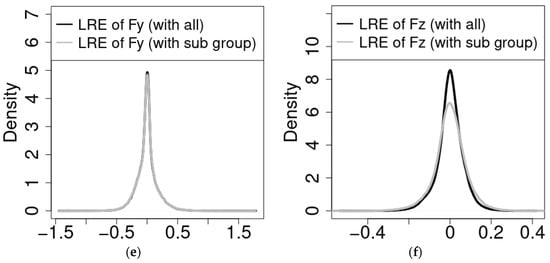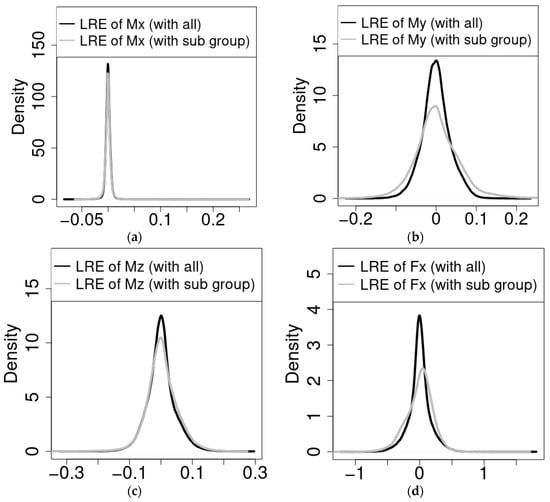 Load relative error [9] distributions for estimated transmission input moments with all predictors (black) and with only the highly important subset of predictors (grey). The panels show the LRE for each of the respective target variables listed in Table 1 (a–f), covering variables v1–v6, respectively.