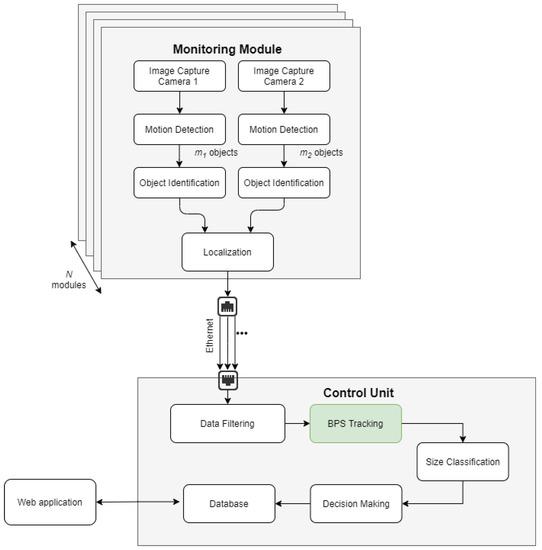 The processing architecture of the proposed solution is presented in Figure 2. Each monitoring module is equipped with a dedicated CPU, processing video stream from cameras coupled in stereo-vision set. Each frame is processed to detect movements and then only detected objects are subjected to the identification bird process as presented in [32]. Each detection classified as a bird is processed further with information about the object’s center coordinates, width, height and contour size. Next, the estimation of the object’s 3D localization is performed [3,6,32].