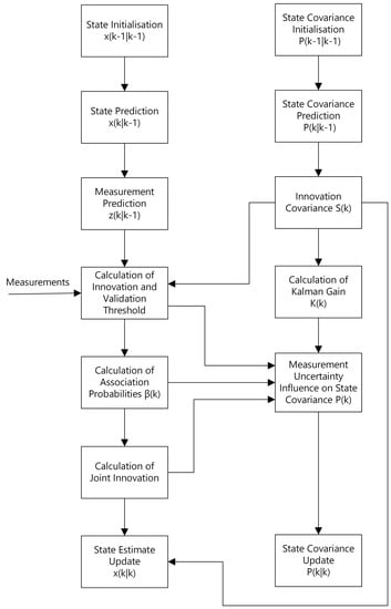 Figure 3 presents the block diagram of the PDA algorithm including the particular steps of Kalman filtering for the reader to have a notion of how these two algorithms cooperate with each other.