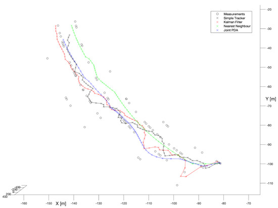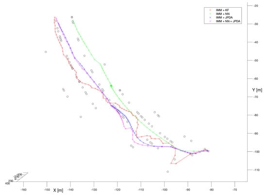 In the last experiment of the second stage, a combination of IMM and JPDA has been examined, what summarizes the Figure 13. The stationary fragments of the longer trajectory have been reconstructed correctly with no substantial deviations. As for all of the model-based algorithms, the filter broke down the track in the location (X = 50 m, Y = −150 m), however, the tracks reinitialization was shorter in time. The main drawback of this filter was the reconstruction of the shorter trajectory.