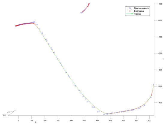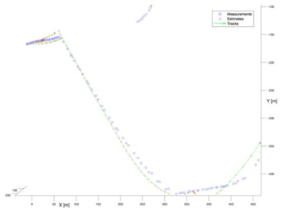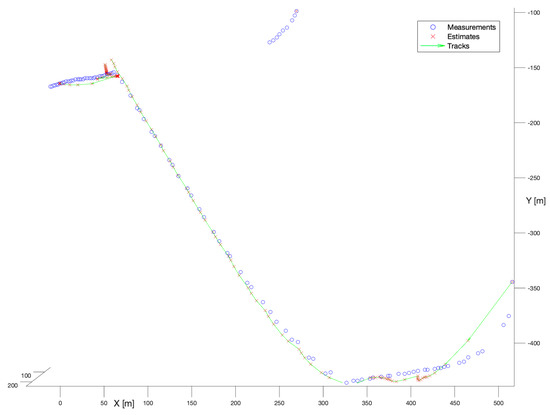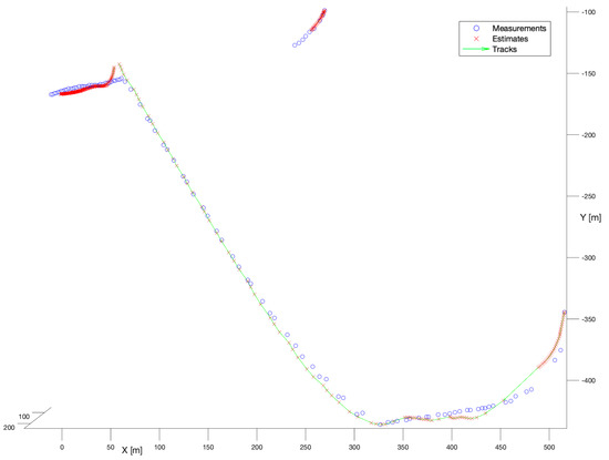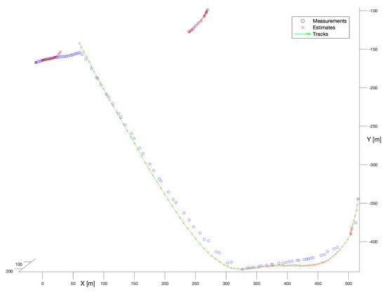 It is not difficult to notice that the observed performance of that filter is unsatisfactory for the WHM system. For the longer trajectory, in the first stage of tracking the filter seems to ignore measurements (except the initial one) and provides a track directly according to the motion model. After the manoeuvre around (X = 300, Y = −450) the filter begins to estimate stably, but in the location (X = 50, Y = −4150) estimation degrades as the filter tries to initiate multiple tracks. The shorter trajectory is not reconstructed at all. The respective track consists of only one point—the initial measurement.