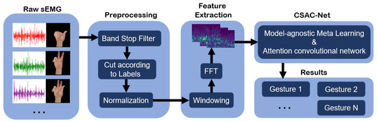 Gesture recognition through surface electromyography (sEMG) provides a new method for the control algorithm of bionic limbs, which is a promising technology in the field of human–computer interaction. However, subject specificity of sEMG along with the offset of the electrode makes it challenging to develop a model that can quickly adapt to new subjects. In view of this, we introduce a new deep neural network called CSAC-Net. Firstly, we extract the time-frequency feature from the raw signal, which contains rich information. Secondly, we design a convolutional neural network supplemented by an attention mechanism for further feature extraction. Additionally, we propose to utilize model-agnostic meta-learning to adapt to new subjects and this learning strategy achieves better results than the state-of-the-art methods. By the basic experiment on CapgMyo and three ablation studies, we demonstrate the advancement of CSAC-Net.