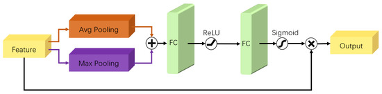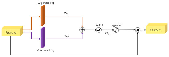 As shown in Figure 5, the Channel Attention Module (CAM) is divided into two parts: the compression module and the excitation module. The compression module collects global spatial information by means of the sum of global average pooling (GAP) and global max pooling (GMP). The excitation module captures the relationships on the channels and outputs an attention vector by using ReLU and Sigmoid. Each channel of the input feature is then scaled by multiplying the corresponding elements in the attention vector. In summary, the Channel Attention Module (with parameter ), with X as the input and Y as the output, can be formulated as: