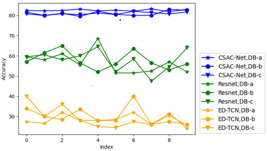 As shown in Table 5, we compared the performance of the hand gesture classification on a new subject between our model and previous methods. Du et al. adopted the method of Deep Domain Adaption for hand gesture classification on a new subject. They obtained the accuracies of 55.3% and 35.1% on DB-b and DB-c, respectively. Sibasankar et al. proposed a method of multilinear singular value decomposition and dictionary learning (MLSVD + DL) for hand gesture classification on a new subject and achieved the accuracies of 75.4% and 68.3% on DB-b and DB-c, respectively. Furthermore, CSAC-Net with MAML obtains the accuracies of 82.50%, 81.00%, and 80.91% on DB-a, DB-b, and DB-c. Moreover, we implemented Resnet18 and ED-TCN (referred to above) with MAML to make a comparison with our network. In order to illustrate the real classification ability of different methods, we calculated the mean accuracy of these architectures. It can be seen that the proposed CSAC-Net with MAML has excellent performance for hand gesture classification on a new subject. Meanwhile, as is illustrated in Figure 9, the stability of the proposed CSAC-Net was better than other methods, with the curve showing little jitter.