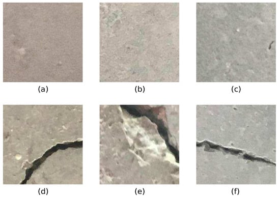 Some typical images from the Mendeley’s data set of “Concrete crack images for classification” [26]. Shadows are absent in all images. Parts (a–c) show concrete surfaces without cracks. Parts (d–f) show concrete surfaces with cracks.